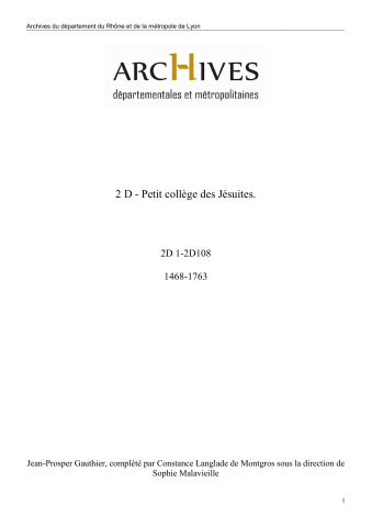 Les articles cotés 2 D 60-66 et 2 D 107-108 se rapportent autant au Petit collège Notre-Dame qu'au Grand collège de la Trinité, ainsi qu'à la formation du Bureau des collèges (voir aussi 3 D), et plus largement au niveau national à l'expulsion des Jésuites de France.