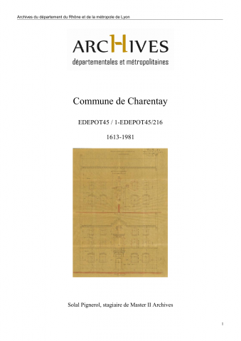 Conformément au Code du patrimoine (article L.212-11), le fonds des archives de la commune de Charentay a fait l'objet d'un dépôt aux Archives du département du Rhône et de la métropole de Lyon le 26 septembre 2019.