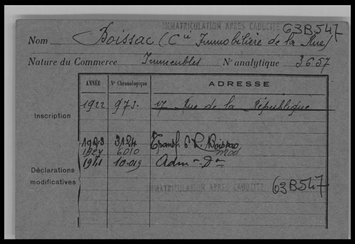 Actes de sociétés, créations, modifications, dissolutions. Registres des actes et jugements de dissolution de sociétés. Répertoire des sociétés et des actes. Registres des liquidations judiciaires. Plumitifs d'audiences, feuilles d'audiences et pièces annexes, jugements. Faillites et liquidations judiciaires : dossiers, registres des liquidateurs. Registres des expéditions. Actes divers : inventaires, prestations de serments, contrats de mariages, cessions de biens, registre du commerce.