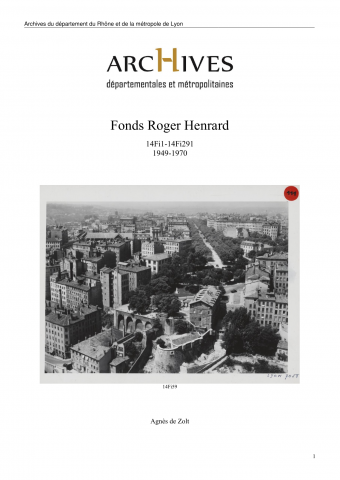 Ensemble de photographies aériennes obliques sur 24 communes du Rhône, composées de 252 clichés noir et blanc, avec un tirage positif et un négatif pour chaque cliché ; de 36 ektas négatifs et de 30 ektas positifs, tous en couleur. D'une grande précision et qualité esthétique incontestable, ces clichés témoignent également de l'évolution du Rhône et tout particulièrement des mutations urbaines de Lyon, comme l'ancien Palais de la Foire, le quartier de Perrache avant la construction du centre d'échanges, celui de la Part-Dieu ou encore le Confluent. Bien que les vues aient toutes été prises à l'oblique, l'inclinaison de l'appareil varie et le rendu s'avère très différent. Les « vues obliques hautes », où l'appareil est presque à l'horizontale, privilégie un arrière-plan visible sur une grande distance au contraire de la « vue oblique basse » où l'appareil étant presque à la verticale, le cadre est très resserré. L'appareil de prise de vues, comme indiqué au verso de la plupart des tirages, était un Planiphote automatique Richard-Labrély monté avec objectif Berthiot ; l'avion, un Norécrin équipé d'un moteur Régnier.