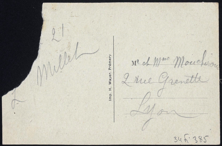 Cartes postales et cartes de correspondance fantaisie essentiellement adressées à Auguste Mouchiroud, à son épouse Louise et à son fils aîné Gaston entre 1901 et 1925. De nombreuses cartes ont été envoyées par Auguste à son épouse et à son fils lors de la période de guerre et témoignent d'une grande tendresse à leur égard. De même, d'enfantines mais très touchantes cartes ont été écrites par Gaston à son père. Auguste Mouchiroud ayant par ailleurs été un collectionneur de cartes postales, il a également soigneusement conservé des cartes adressées à d'autres personnes liées familialement ou amicalement aux Mouchiroud. On trouve ainsi notamment Jeanne Rigard, papetière possiblement née à Bourg-en-Bresse en 1866, qui habita 6 rue de la Vieille Monnaie, 91 montée de la Grande Cote, 16 rue Bellecordière ou encore 4 rue Pomme de Pin, à Lyon. A plusieurs reprises, Jeanne Rigard est qualifiée de marraine par Gaston, elle devait donc avoir des liens forts sans doute avec Louise Mouchiroud, à qui elle écrit fréquemment. Parmi les correspondants plus ou moins réguliers figurent un dénommé Francisque Rigard (fils de Jeanne ?) au 60 cours Lafayette à Lyon ; une dame Caillat, 54 rue de l'Hôtel de ville à Lyon ; un sieur Camaro, 2 rue Grenette à Lyon ; et enfin, une dame Gabrielle Benoit à Lons-le-Saunier. Louise Mouchiroud et son fils aîné séjournent d'ailleurs régulièrement dans le Jura, où Auguste leur écrit. Enfin, nombre d'amis et de clients écrivent aux Mouchiroud. Les dates extrêmes mentionnées correspondent aux dates des correspondances échangées et non à celles de l'édition des cartes postales.