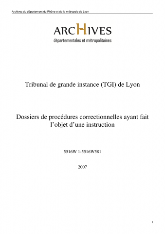 5516W - Tribunal de grande instance (TGI) de Lyon - Dossiers de procédures correctionnelles ayant fait l'objet d'une instruction