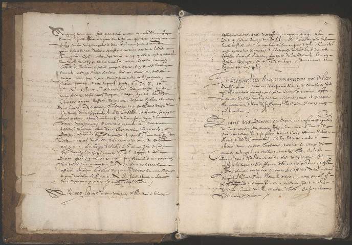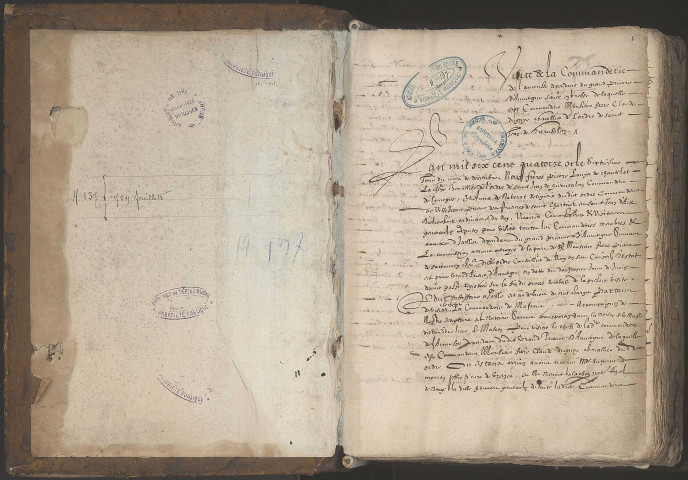 Tome II. Visite par les commandeurs de Chantelot et de Naberat de la commanderie de Laumusse : enquête sur les personnes, visite de la chapelle sous le vocable de St-Jean et N.-D., l'ancienne « a esté ruynée et bruslée par les guerres passées », de la maison du commandeur, du domaine consistant en terres, prés, vigne et bois, terre « d'Eschaumont, du Machura, pré à Replonges, pré de la Nielle, pré de la Pierre en la prérie de Manziaz. » Cens et rentes sur « Replonges, Giraudières, paroisse de St-André de Baugé, Baugé, Crottet, St-Jean sus Velle, St-Cire, Sainct-Genis, Pont-de-Velle, Laix, Cruzillies, Mespilliaz, Cormarenche, St-André-d'Huyriaz, Baugé-la-Ville, Bereysia et autres lieux ». Dîmes à « La Giraudière, paroisse de St-André de Baugé, au Moulard, autrement disme d'Eschomont, rière la parroisse de Replonge et villages de Romanesche et du Moullard, à Escotey, rière la paroisse de Baugé-la-Ville ». Les officiers de justice n'ont pas de gages, mais le droit de prendre du bois dans la forêt de Tessonge. Chapelle de Vavrette, dîmes aux Bruyères, cens et rentes sur « Baugé la Ville, Bruyères, Manzea et Villier » ; « petit pré de la Pierre, de Muenoz, au Nuyselet, la charrée de Nuyselet. Moulins de « Chaptemps », près Pont-de-Veyle. Annexe de Sémon. Inventaire des meubles de la commanderie. Annexe d'École, paroisse de Verzé ; dîmes à Sarrières et Écoles, cens et rentes à École, Berzé-la-Ville, Buxières et Sarrières ». Juridiction au sr de « St-Sernin ». Cens et rentes à Pont-de-Vaux, « Verney, Reyssouze, parroisse de Grenon ». Membre d'Épaisse, chapelle, maison, jardin, vigne, prés, taillis, du « Fetelez, du Curtil », terre du Champ de la Porte, au Sochey ; rentes sur « Baugé-la-Ville, Saint-Sulpis, St-Genys, Bereysia, St-Jean-sur-Reyssouze, St-Estienne-sur-Reyssouze, Perex, Chanoz, Flurieu près Chastillion-de-Dombes » ; dîmes sur « Bosmein en la Chaveya, Chavaney, Montrozier, Montbarbon et Cormagnoux, Nucudey ». Inventaire des titres de la commanderie ; état des revenus. Membre du Temple Saint-Martin : maison de bois et torchis, « terre de l'Estang, terre et pré de la Paterla, pré Broier, rippes, brussailles et champéages de Champt Ferry », bois ; rentes sur « St-Martin-le-Chastel, Cuel, St-Didier, Montrevel, Malaffretta » ; dîme sur Cuet. Juridiction au marquis de St-Martin. Annexe d'Escopet ; chapelle et maison de bois et torchis, « terres du Courtil de Lamusse et du Temple, des Feugières, pré Duby, étang, pré de la Leva, pré Martinet, pré et terre des Sunières, pré d'Escopey à Cursiaz, forêt ; dîmes à Escopey, Deyssiaz, Curtez ; cens et rentes à Romanés, Curtiaz, Curtez, St-Nizier, Sauvignaiz » ; justice au comte de St-Trivier. Annexe de « Simon » : chapelle, rentes sur « Cuseau, Simon, Dontmartin, Champignas, Vaulx, Marcias, Villars-soubz-Joudes, Joudes » ; justice au prince d'Orange. Membre de Bocarnoz : chapelle, « prés du Grand-Bru, du Petit-Bru, pré de Boccarnod », vigne ; rentes sur Coligny et dépendances ; juridiction à MM. de Coligny-le-Vieux et de Coligny-le-Neuf. Membre de Tessonge : chapelle dont la cloche « a esté emportée du temps des troubles par les gens de guerre, qui l'emportarent au chasteau de Bonrepos, appartenant à M. le comte de Montrevel, où elle est encore à présent » ; « rippe, maison de brique et torchis, forêt ; dîmes sur Mangettes, cens et rentes sur Bourg, Montagniaz, Sezirias, Virias, les Mangettes, Noliona, St-Estienne-du-Boys, Foyssia, Cuel, Pollias, Marbos » ; Juridiction au sr de Bonrepos. Chapelle « St-Jean de Trébourt, prez de Bourg, en la paroisse de Fleurias, deppendante de Virias » : chapelle et pré. Charges de la commanderie. Ordonnances de réparations. Conclusion de la visite. Commanderie de Bellecombe (f° 65) : chapelle et maison forte, jardins, prés et bois, « pré à Chesargue, vigne à Vallanssin » ; mobilier ; juridiction « au roy, et à présent à M. du Passage, pour raison de la terre et seigneurie de St-Georges d'Espérance ». Annexe de « Vallanssin » : église de St-Vincent (st-sacrement dans une boîte d'« arquemie ou argent de Limoges »), chapelle démolie à côté, cure, juridiction commune avec le roi ; état des reconnaissances. Membre de La Verpillière : église St-Denis (vitraux de St Jean-Baptiste et de Saint Denis, aux armes du grand-maître de Verdalle « et du feu sr de La Porte ») ; juridiction « au sr Mareschal d'Esdiguières, pour cause du chasteau de Falavié » ; pré « au Danais », vigne, bois de châtaigniers, dîmes sur les terres « du Puys-Durant et la Thuillière ». Annexe du « Péage de Septesme » : chapelle, rentes sur « le Péage et Chalaisin », maison de l'Hôpital « qui soulloit estre un hospital pour loger les pauvres », chapelle de « La Chal », maison de l'hôpital. Annexe de Ponas : chapelle ruinée, dîmes à Ponas, cens et rentes sur « Ponas et Meimefamille » (Bonnefamille). Membre de Vourey, chapelle ruinée, maison, terre de Chantemerle, moulins du Temple ; juridiction au roi « pour cause de la terre de Tullins ». Annexe du Temple d'Ornacieux : chapelle, maison de la commanderie « ruynée par le siège de La Coste, faict environ cinquante ans », bois, terres de « la Rivoyre » ; dîme sur « Ornassieu, Semon et Comelle » ; terre de La Templière, bois de chênes, au max des Sonnettes, vigne au Grand-Cloz, lieu de Barbin, terre au max de la Revoyre ; juridiction de l'évêque de Grenoble ; cens et rentes sur « Ornassieu, Comelle, Semon, Barbin, Bressieu, Bersin, Bysonne, Geronney, Faramans ». Annexe du Temple de Bressieux : chapelle du Temple de St-Jean ; juridiction au sr de Bressieu. Abergements : terres et bois de « Pra Maz, Sezarges, Péage, Vallensin, maison de la Tourt de Rolland à la Côte St-André, pré de Langueserre, etc. ». Membre de La Chal : chapelle dans le château, domaine, terre au « terroir d'Éguebelle » ; cens et re